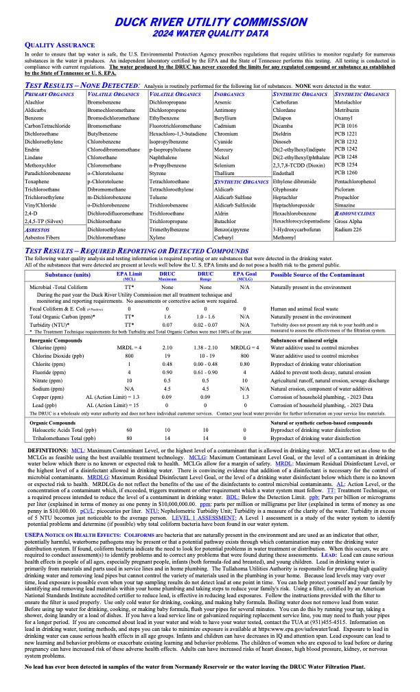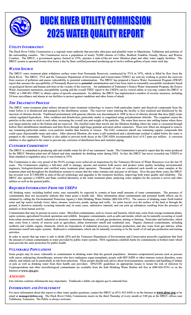 DRUC produces a Consumer Confidence Report each year to inform customers about the quality and availability of the drinking water supplied to Manchester, Tullahoma, and the surrounding communities. The content of the report and the format of the data are prescribed by USEPA regulations. Interested customers are encouraged to reach out to their local water supplier with questions about the information.